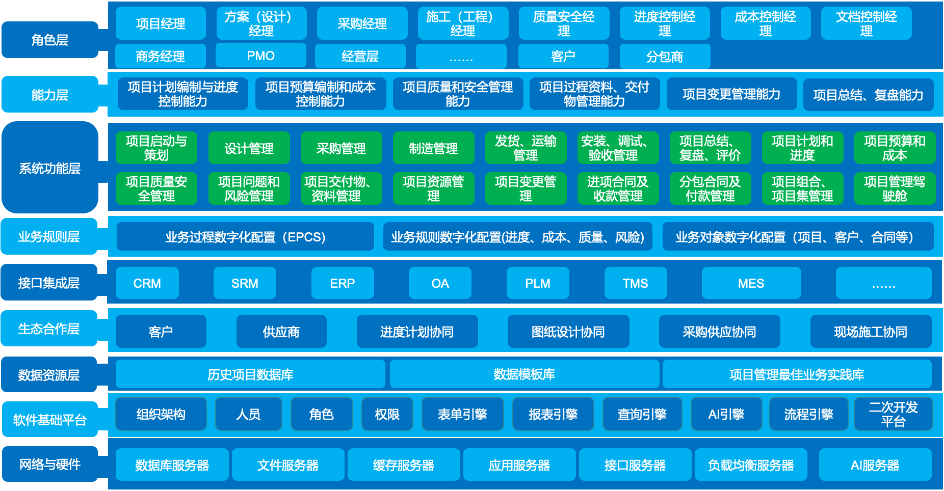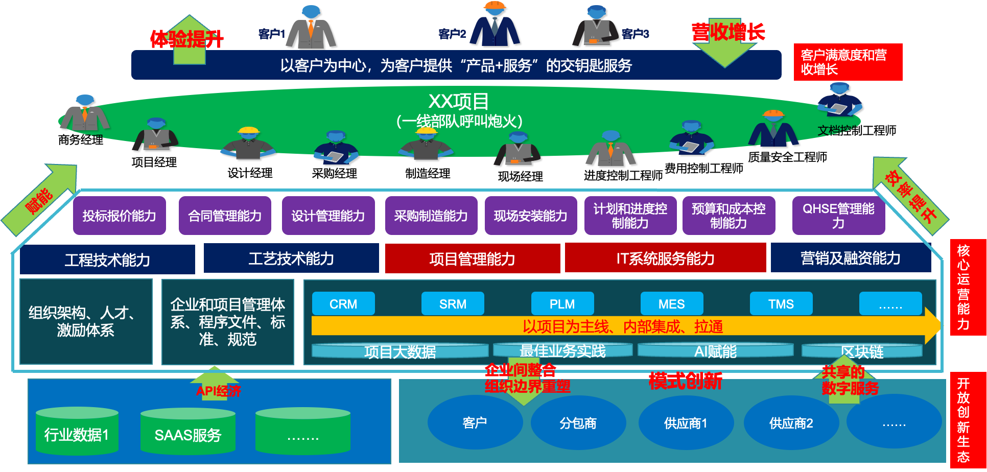 一个项目全过程、全要素管理的数据集成平台; 一个连接和赋能项目参与方的生态合作平台,实现服务型制造企业项目管理的组织在线、沟通在线、协同在线、业务在线和生态在线。